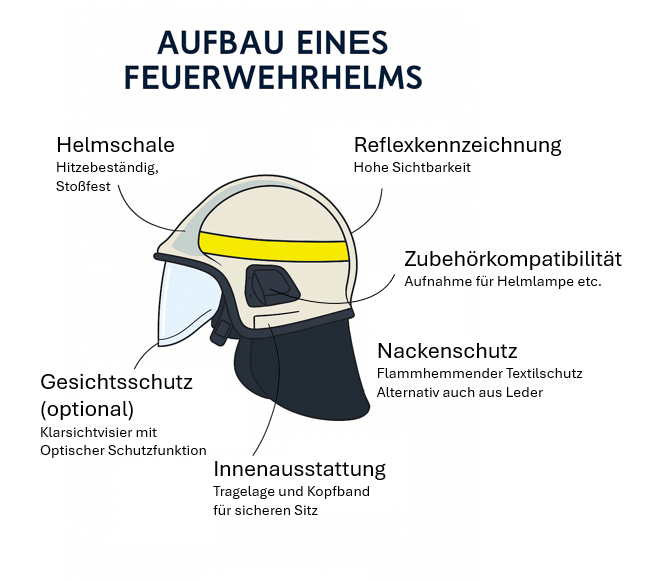 Der Feuerwehrhelm nach DIN EN 443:2008-06 ist ein zertifiziertes Kopfschutzsystem für Feuerwehrangehörige bei Innen- und Außenangriffen. Er schützt zuverlässig vor mechanischen Einwirkungen, thermischer Belastung, elektrischen Gefahren und chemischer Kontamination. Die Norm unterscheidet zwei Helmtypen: