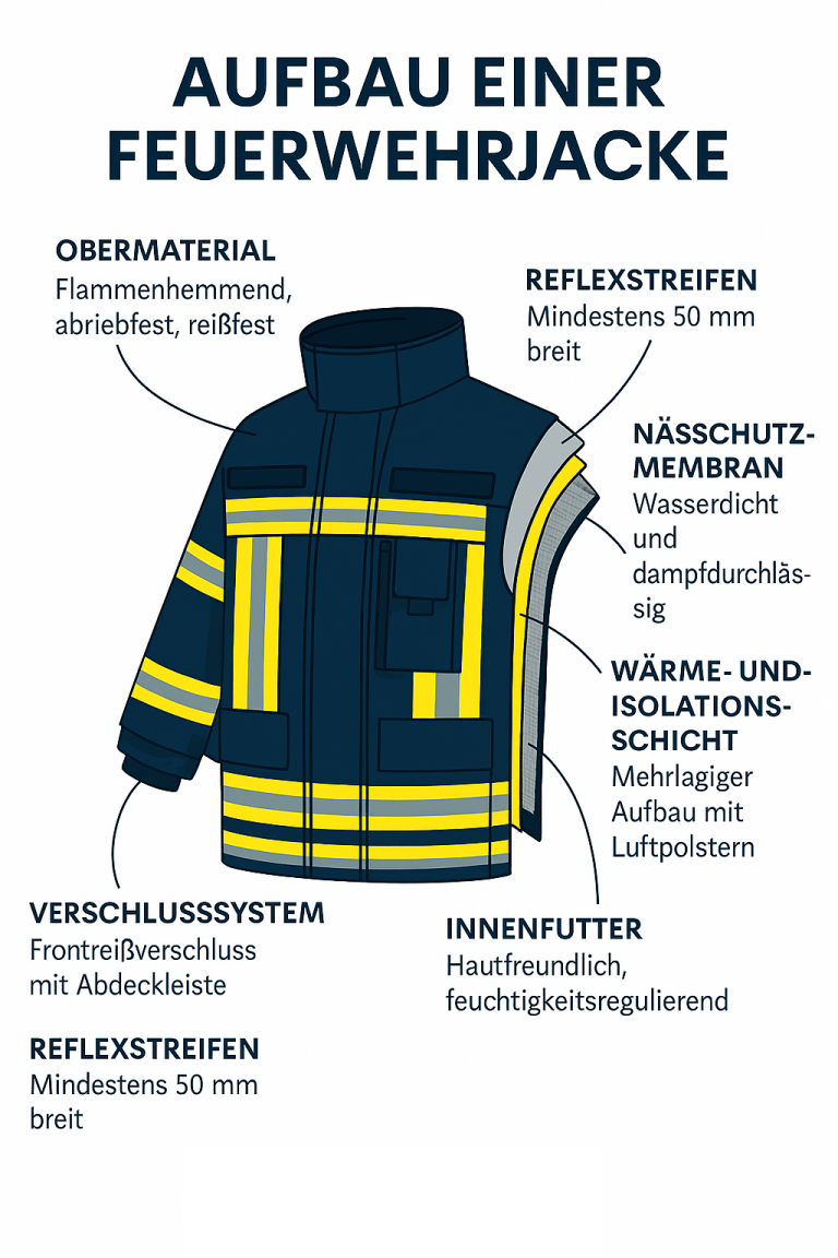 Die Feuerwehrjacke nach DIN EN 469:2020-12 ist Bestandteil der persönlichen Schutzausrüstung (PSA) für Feuerwehrangehörige. Sie schützt vor Wärme, Flammen, mechanischen Belastungen, Feuchtigkeit und eingeschränkter Sichtbarkeit. Die Norm unterscheidet zwei Leistungsstufen: